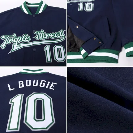 Custom Navy White Kelly Green-Gray Bomber Full-Snap Varsity Letterman Jacket